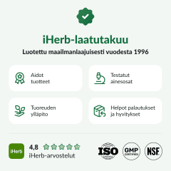 Vaikka iHerb pyrkii varmistamaan tuotekuviensa ja -tietojensa oikeellisuuden, jotkin pakkausten ja/tai ainesosien valmistusmuutokset saattavat odottaa päivitystä sivustollamme. Vaikka tuotteet voidaan joskus lähettää vaihtoehtoisissa pakkauksissa, tuoreus on aina taattu. Suosittelemme, että luet kaikkien tuotteiden etiketit, varoitukset ja ohjeet ennen käyttöä etkä luota pelkästään iHerbin tarjoamiin tietoihin. Tämä verkkosivusto on konekäännetty asiakkaita varten. iHerb ei takaa, että käännökset olisivat täydellisiä tai virheettömiä, eikä iHerb ole vastuussa mahdollisista käännösvirheistä tai puutteista.